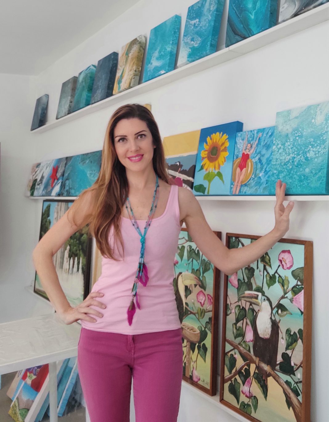 De entre todas mis obras, destaca la colección de pinturas sobre arquitectura que dediqué a Santa Cruz de Tenerife y que me llevó 3 años de trabajo diario ante el caballete. Alguno de estos cuadros decoraron los camerinos de dos actrices con Óscar de Hollywood. Por esta colección pictórica fui reconocida en el Parlamento de Canarias en2017. Uno de mis cuadros surrealistas se encuentra de manera permanente en el Museo de Los Sabandeños. Este mismo año creé la portada del disco El Cantor de Aguere. Mi colección titulada El Mar de La Vida fue el escenario de grabación del tema musical del productor Ykay Ledesma, dicha colección pictórica es un grito por defender y cuidar nuestros océanos. En 2019 me eligieron para participar en la exposición de arte postal sobre la Mujer más grande del mundo celebrada en Freudensdt, Alemania, también en La preciosa Capilla Pillotti de Italia y en La Bienal de La Creatividad de Movicentro, Italia. Mis cuadros han formado parte de los decorados del programa líder de audiencia de Canarias En Otra Clave. Fui la creadora y comisaria de la exposición Pequeños Grandes Artistas, formada por más de 40 obras pintadas por niños y en cuyas inauguraciones transmitimos respeto, igualdad y visibilidad, entre otros valores, utilizando el leguaje inclusivo.